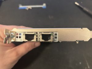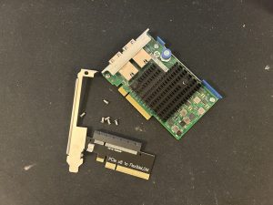 Ovdje sam išao maksimalno štedeći, uzimajući doslovno najjeftinije opcije za koje sam pročitao negdje da bi mogle raditi. Ništa fancy, samo kemija 😀 Ovdje govorim o rj45 mrežnim karticama, nešto povoljnija je situacija s karicama sa SFP+ portom. Dvije su najjeftinije opcije, jedna je serverska HP FlexibleLOM Ethernet 10Gb 2-port 561FLR-T 2 port 10G kartici te PCIE X8 to FlexibleLOM adapteru, bazirana na Intel X540 kontroleru. Kombinacija1 od 35$ koja radi dobro, kartica je odmah prepoznata od Windowsa, instalirani driveri i sve je spremno za rad. Minus je što se nešto više zagrijava, odnosno, kartica je predviđena za serversko okruženje te se podrazumjeva stabilno strujanje zraka preko kartice. DIY modovi s ventilatorom nisu ništa čudno, jer kartica jako loše radi dok je vruća.